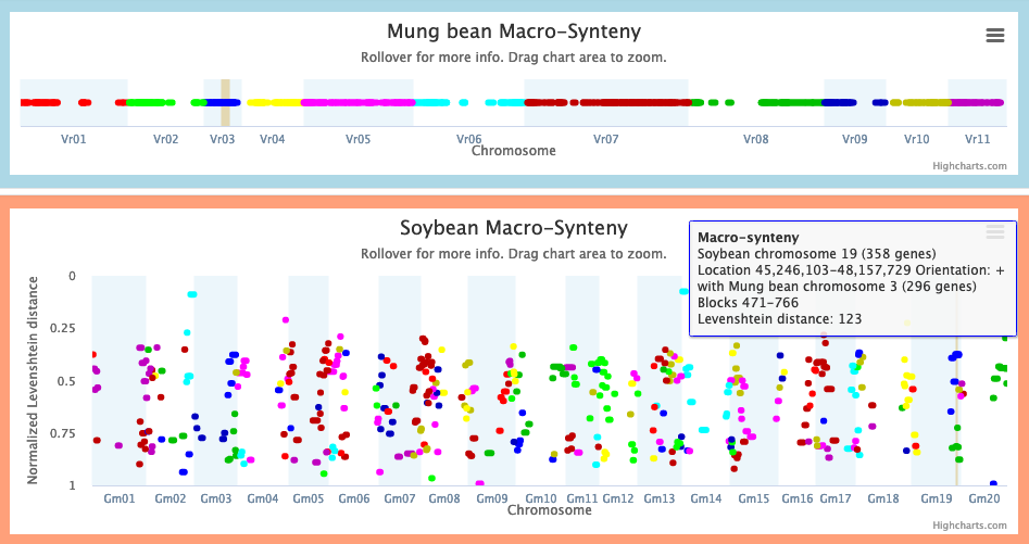 Example: the rightmost dark blue macrosynteny block of Soybean chromosome 19, from 45.2-48.1 Mbp, is macrosyntenic to blocks 471-766 of Mung bean chromosome 3, which overlaps our selection.